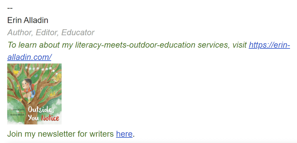 - Create an email signature that includes a cover image of your book, a link to find it online, and a simple call to action. Use it for all your email correspondence.